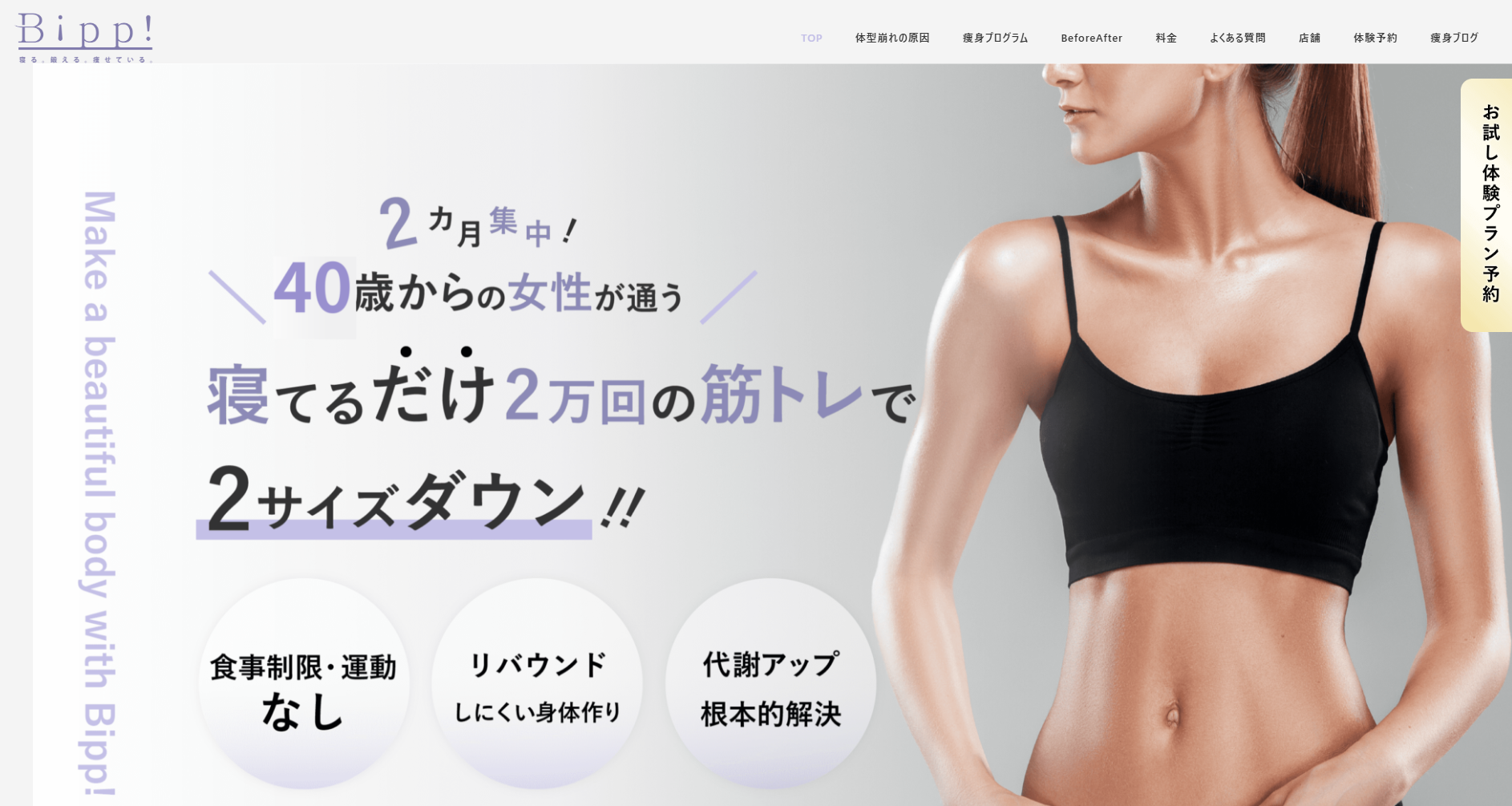 ジムに通うのも、食事制限するのも正直キツい。でも、このまま体型が崩れていくのはイヤだ! そんなあなたに、超画期的なボディメイクサロンがあるんだ。 それが『寝る。鍛える。痩せている。Bipp!(ビップ)』!