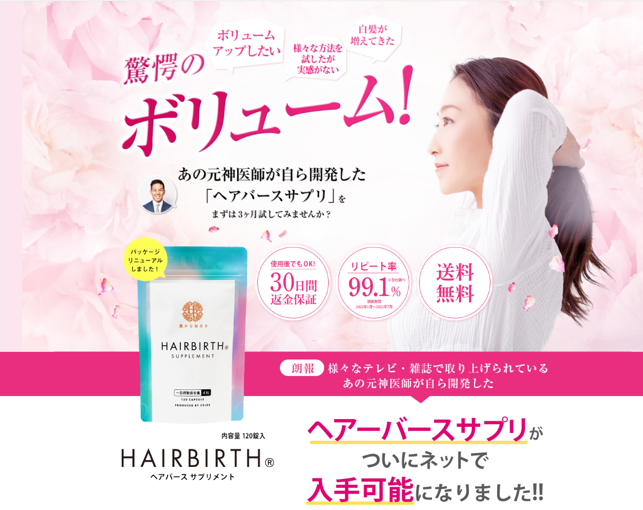 そんな風に、誰にも言えない髪のお悩みを抱えているすべての女性に朗報です! 数々のメディアや書籍で活躍する、あの「元神医師」が自ら開発したという、まさに「神サプリ」、その名も「ヘアバースサプリメント」が、ついにネット販売解禁となりました。