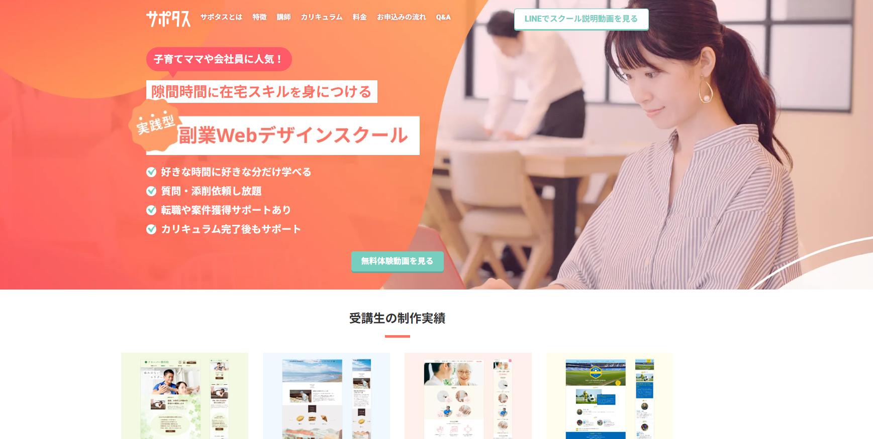 サポタスは、「Webデザインのスキルを身につけて、副業で月10万円以上稼ぐ」という目標を叶えるための、実践型オンラインスクールなんだ。特に、子育て中のママや、本業の傍らでスキルアップを目指す会社員にぴったりな、柔軟な学習スタイルが魅力。