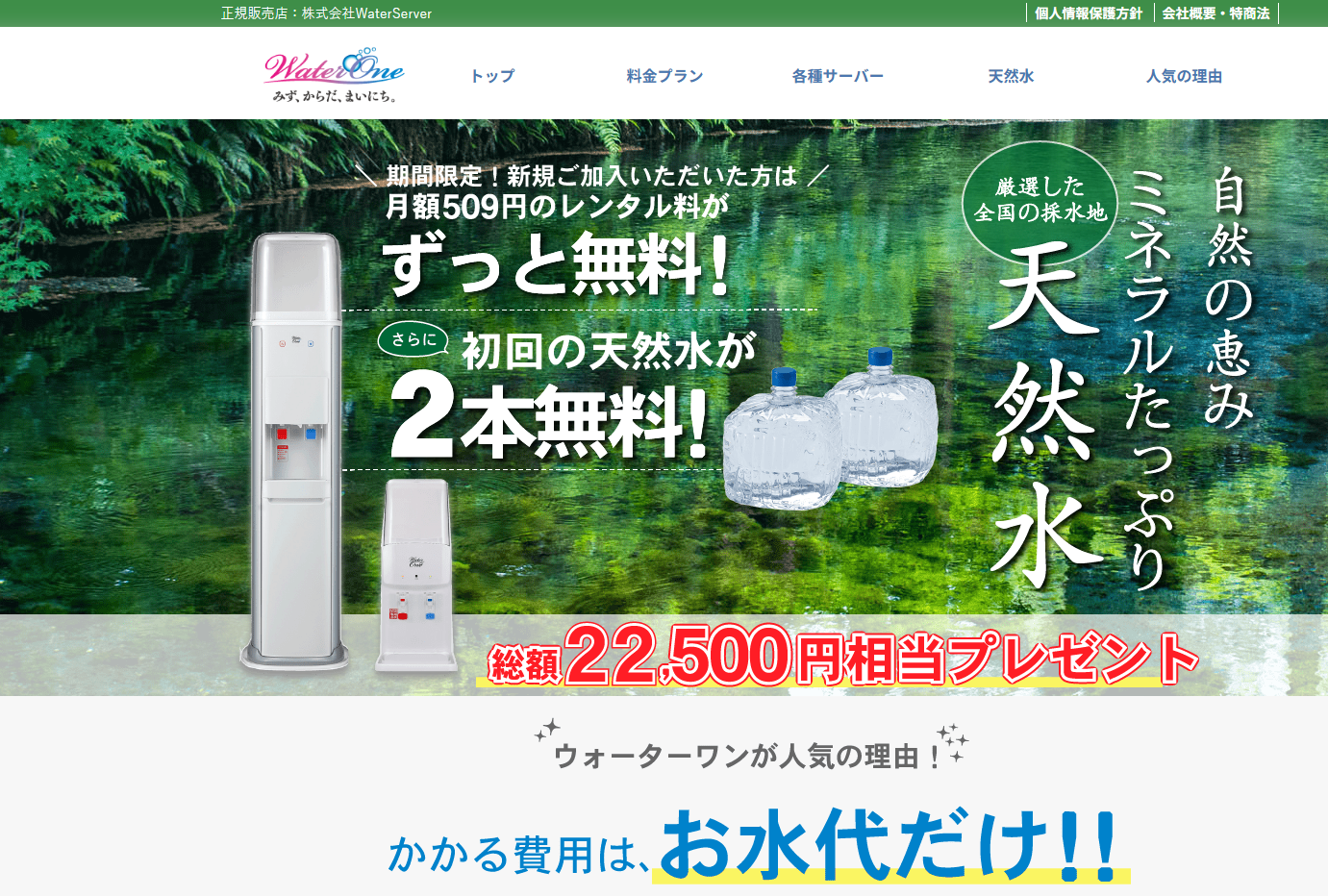 今なら当社の独自キャンペーンとして、お客様にキャッシュバックを適用! お得にウォーターサーバーを始められる大チャンスです。 この機会に、ウォーターワンで豊かな天然水生活をスタートしてみませんか?